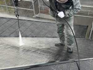 高圧洗浄は、外壁や屋根に付着したホコリ、汚れ、コケ、カビ、古い塗膜の粉などをしっかり洗い流すための工程です。